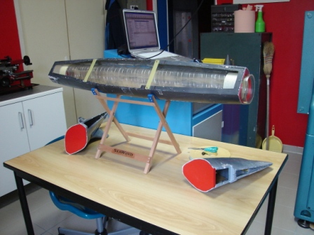 La coque en 3 morceaux. A l'arrière: la propulsion et le stockage de l'énergie. Au milieu: le mécanisme des aériens et le ballast principal. A l'avant: le stockage de l'air, le compresseur et le mécanisme de barres avants.