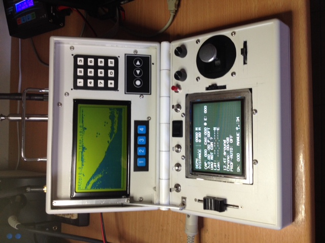 Voici une photo du proto de la radio sur le mode de navigation sondeur, désolé, je ne peux pas la mettre à l'endroit car le site refuse de charger les images corrigées ??? . Les touches bleues servent aux modes de plongée, les touches de défilement pour les modes d'affichage : sondeur seul, sondeur et carte, télémétrie et carte (sondeur seul sur la photo). Plus de détails sur demande, et si une personne souhaite participer au projet, elle sera la bienvenue !