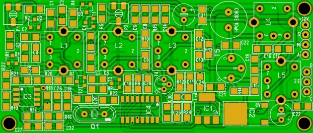 Le design de la carte HF émission à synthèse de fréquence est prêt et part en fabrication, cette carte pourra être programmée en 27, 35, 40 et 41MHZ, les canaux de chaque bande programmables directement à partir de l'émetteur, dimension : 80x34mm. Je vais prévoir également la possibilité de l'utiliser à partir d'un émetteur du commerce.
