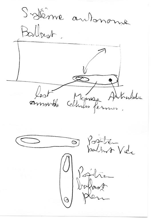 J'ai pensé à un système de lest sur flotteur en polyurétane articulé avec une tige de déport plus ou moins longue . Position basse en flottaison surface , position haute en plongée .