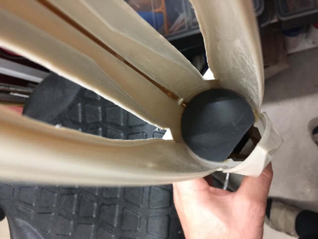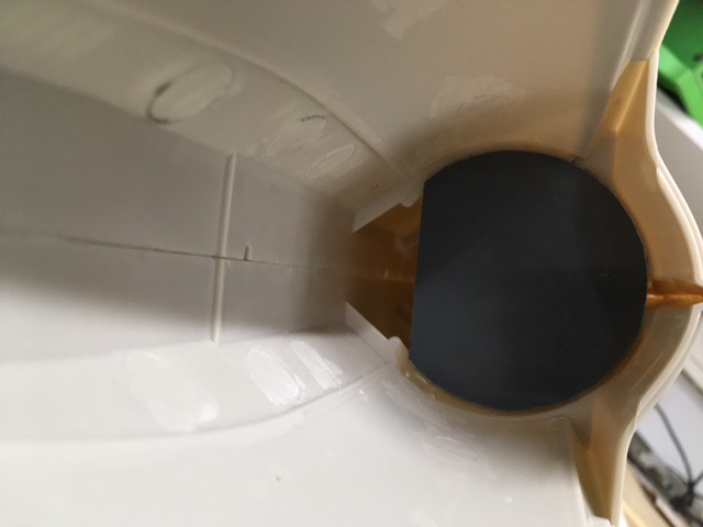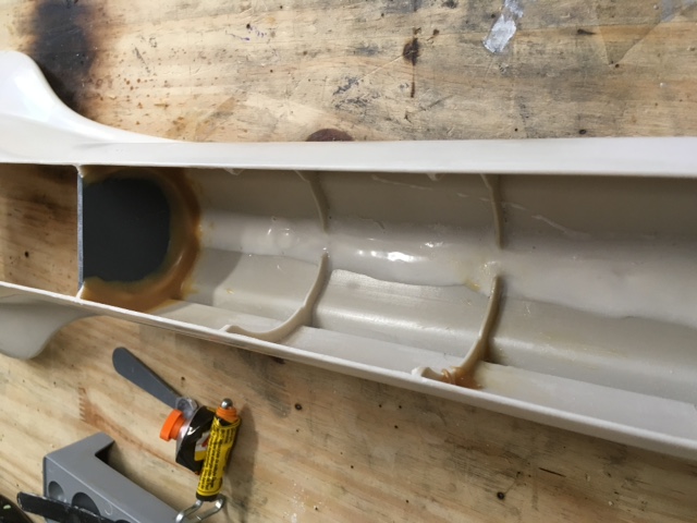 J'en profite pour couler un peu de resine PU dans le fond de coque pour boucher le V et eviter ainsi des micro fuites.