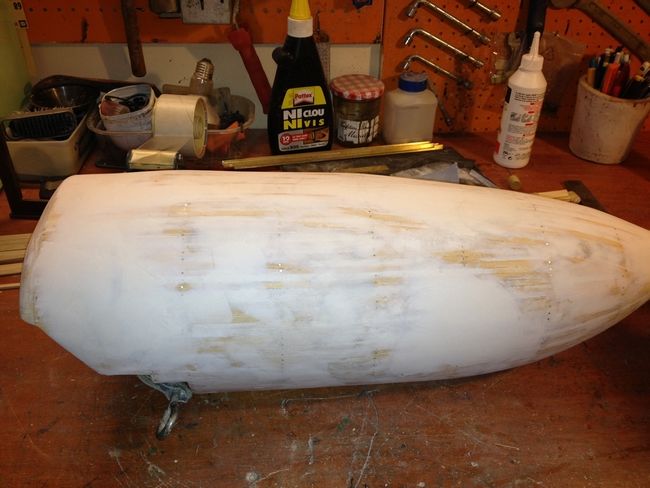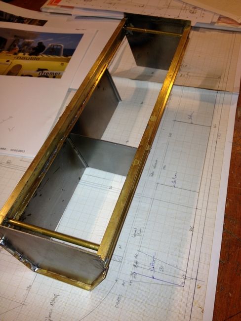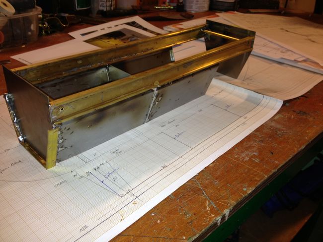 La première partie de la coque est terminée. Reste les nombreuses suite de vernis puis ponçage. Du coup, entre 2 séchages, j'ai commencé le châssis. Il contiendra les batteries. La coque sera fixée sur les longerons en laitons... Les soudures ne sont pas nettoyées, j'attend de tout finir.