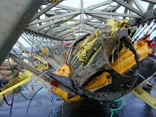 Un système sophistiqué comprenant un treillis metallique à été placé au dessus de la coque, puis une série de harnais à été passée sous la coque et rattachés au treillis, faisant une sorte de berceau, le tout a alors été remonté en surface par la grue du navire Karlissa le 8 Août 2000, c'est-à-dire 136 ans après son naufrage.