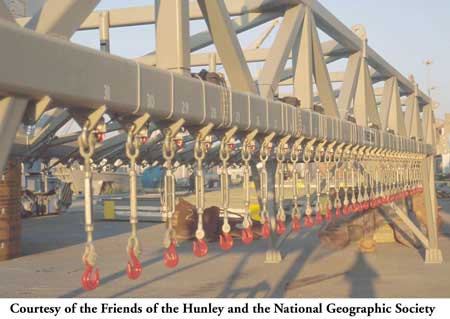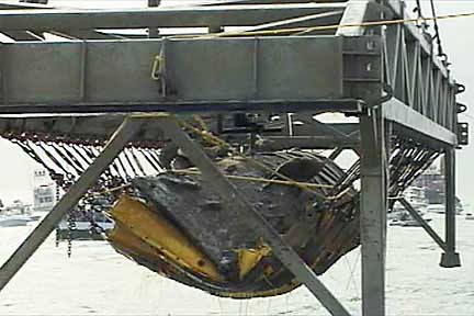 Le hunley remonté en surface tenu par les harnais sous le portique : Vue de la proue