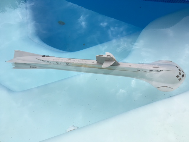 Alors que j'avais pris les pieces en abs de cette maquette et que je m'etais aperçu qu'elles coulaient direct au fond du lavabo, je pensais qu'il n'y aurait que le volume du compartiment etanche pour contrecarrer tout ça et faire flotter le bezingogne... sauf que, le tout pesant env. 1,6 kg, et le volume du compartiment etanche etant de 0,8 L, je m'attendais a voir couler literralement tout ça et je reflechissais surtout a de futurs emplacements de flotteurs en mousse,