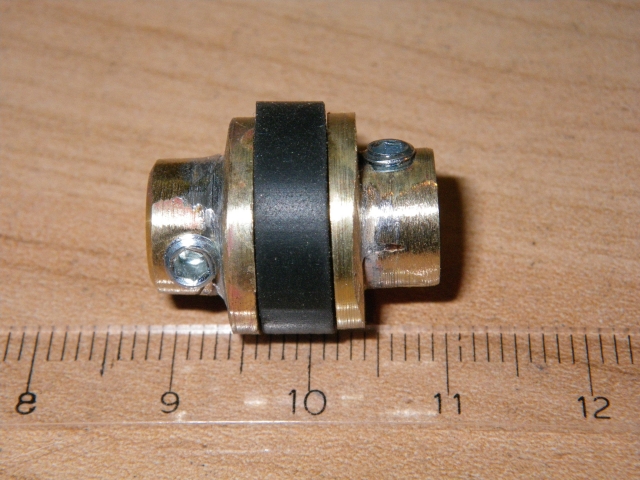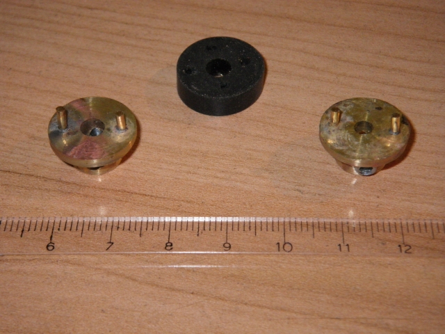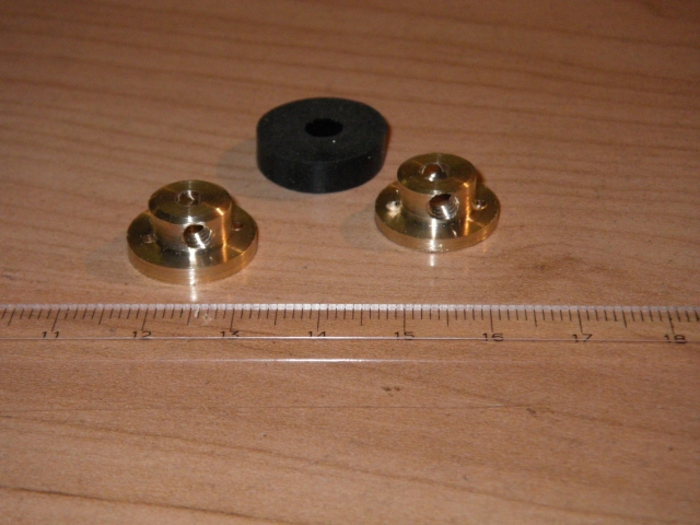 Deux flasques tournés, percés puis taraudés M4, puis percés et soudés pour recevoir les ergots, la rondelle caoutchouc est percée, l'ensemble est assemblé :