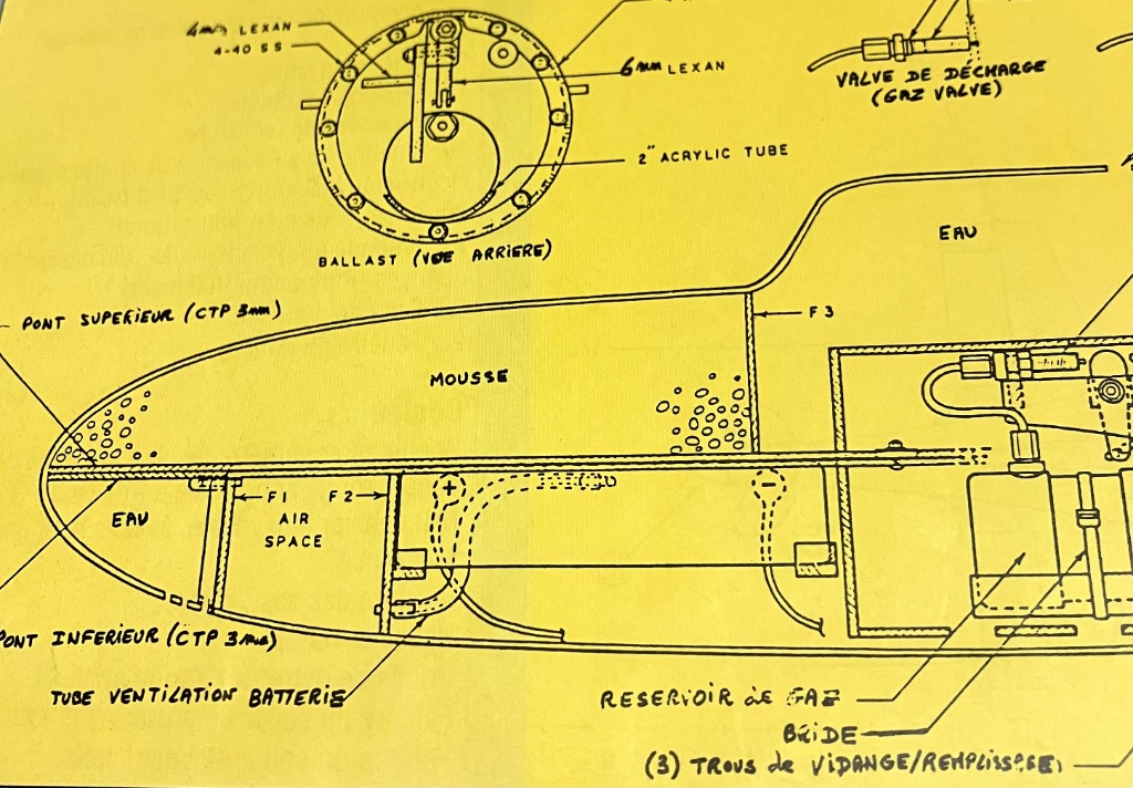 À regarder le schéma plus haut, on voit qu'ils indiquent de la mousse dans la partie haute de la coque (si j'ai bien compris ?). Personnellement, je trouve cela problématique : Cette mousse se retrouve, si je comprends bien, au-dessus de la ligne de flottaison et c'est donc un volume que le ballast doit compenser pour plonger. C'est à mon avis à éviter. S'il faut rajouter de la mousse pour augmenter la flottaison, il faut que la mousse soit en dessous de la ligne de flottaison pour qu'elle soit toujours immergée, et donc qu'elle n'ait pas d'impact sur la quantité d'eau à admettre pour plonger.