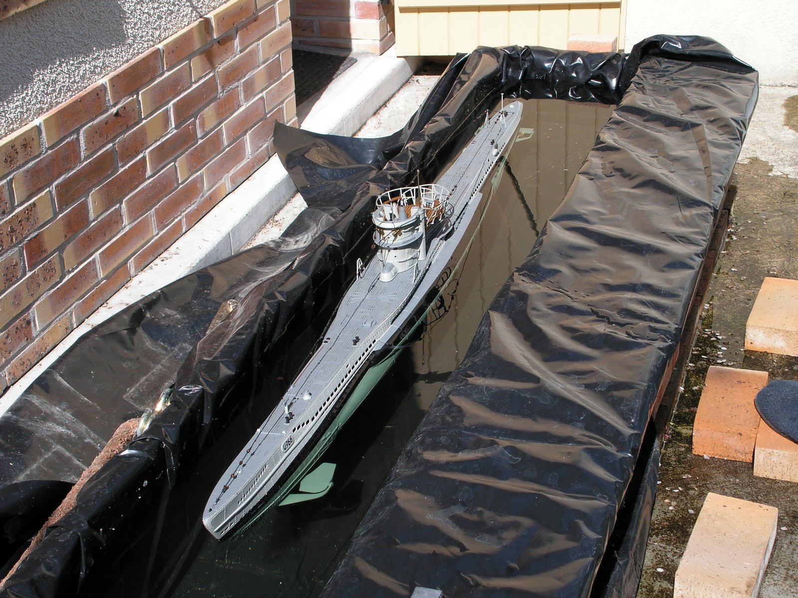 Essais de plongée : tout va bien ! Le bassin est juste assez profond pour submerger totalement le sous-marin.