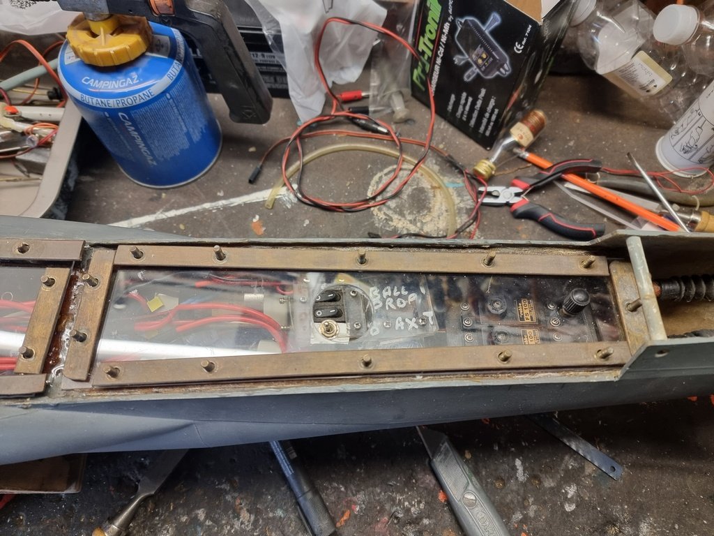 Aller c'est reparti, refabrication des trappes qui avaient bien vieillies, changement des durites pour les entrées et sorties d'eau, quelques réglages et ça sera tout bon. Recollage d'une entrée d'eau dans la coque aussi.........