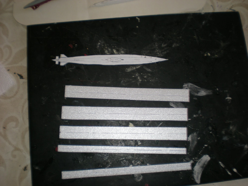 Ma méthode repose sur le dépron, j'effectue mon plan au 1/400.Pour exemple le type XXI.J'ai opté pour la conception horizontale en prenant pour 1er élément celui des safrans de barres de plongées arrières.puis j'ai collé les autres tranches de part et d'autres.Voir photos