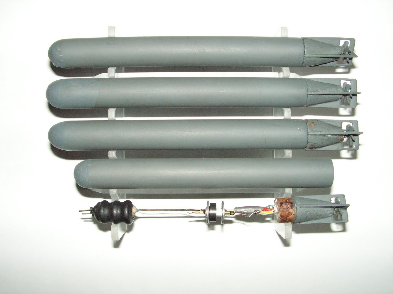 Le cône arrière de la torpille est taillé dans un bouchon de liège et contient le moteur. Celui-ci est issu d'un mini-servo.