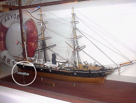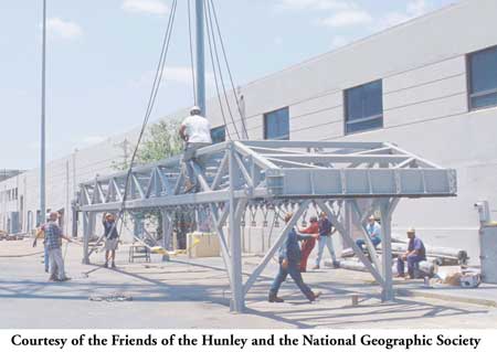 Le hunley remonté en surface tenu par les harnais sous le portique : Vue de la proue
