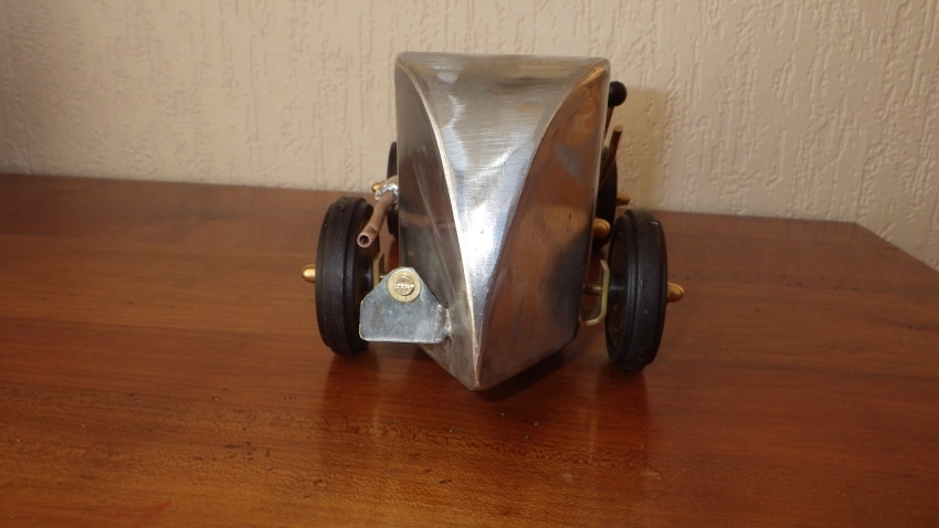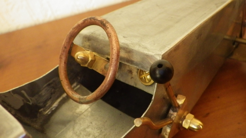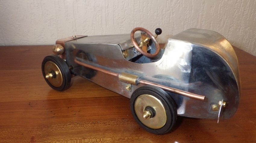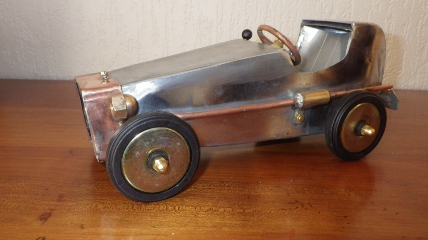 Quelques chutes de zinc restant de la construction du Hunley, un peu de laiton et de cuivre qui traînaient dans l'atelier, et hop une petite voiture artisanale de 25 cm de long environ(modèle unique :roll: ), en métal pour Paul, mon petit fils dont c'est l'anniversaire... 9 ans !