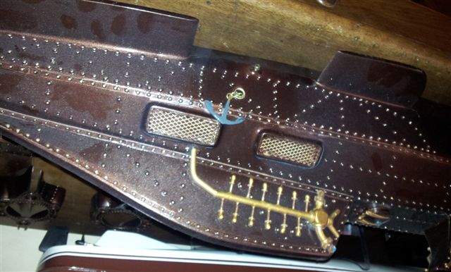 J'ai réfléchi un moment ou est-ce que j'allais bien positionner ces satanées Ancres !! pour finalement utiliser les prises d'eau des ballast...bricoler un peu avec des petits anneaux en laiton ...pour faire comme si la chaine sortait de la quoi...c'est la seule et unique idée que j'ai eu !...