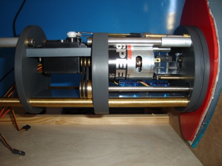 Sur les photos on peut voir le mécanisme pour le piston d'équilibrage arrière, les moteurs de propulsion, les servos de barres et deux petits servos qui servent: pour l'un à commander le piston arrière et pour l'autre à couper un des moteurs de propulsion.