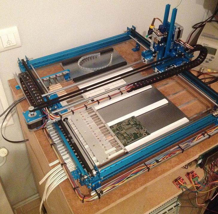 Afin de câbler plus facilement les cartes équipées de composants à pattes très fines, la machine de placement automatique est idéale. Compte tenu du prix important de ce type de matériel, j'ai choisi d'en fabriquer une spécifique pour les cartes de l'auto-pilote. Après quelques réglages, la machine fonctionne . Une fabrication sérieuse va pouvoir commencer !