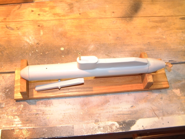 Pas mal de difficultés pour l'équilibrer, j'ai dû lui ajouter deux appendices sur la coque à l'arrière pour augmenter la flottabilité et un plomb de 10 gr à l'avant...