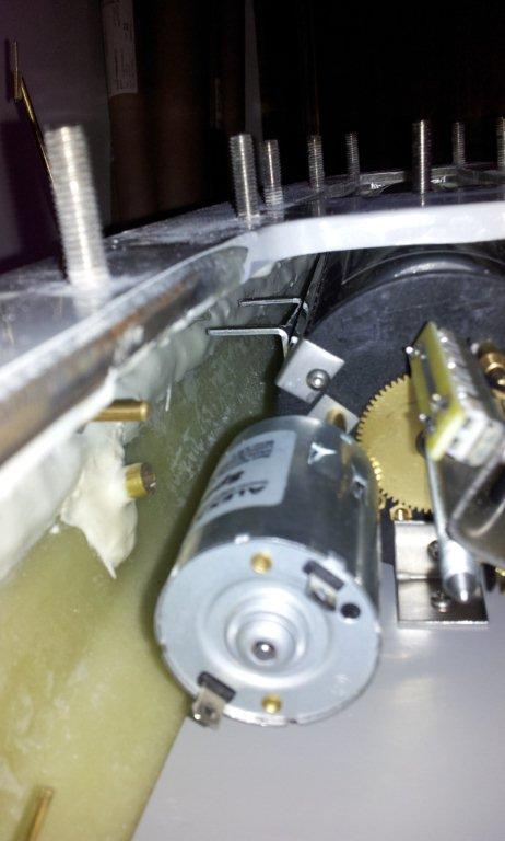 Mesurer ensuite la distance (env 70mm) entre l'axe fixation de la tringlerie sur cette pièce à la platine du WTC...histoire de confectionner par pliages la plaque alu afin que l'axe de rotation du servo posé dessus, soit à la même hauteur.. mise en place à l'extérieur..positionné avec le ballast avant...parce que c'est un peu ric rac niveau place...