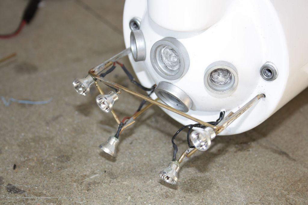 De mémoire, les fils sont passés à travers le bouchon avant, étanchés avec du silicone. Un fil de masse commune et les autres pour le plus de chaque led. La masse commune étant soudée au laiton de l'arceau.