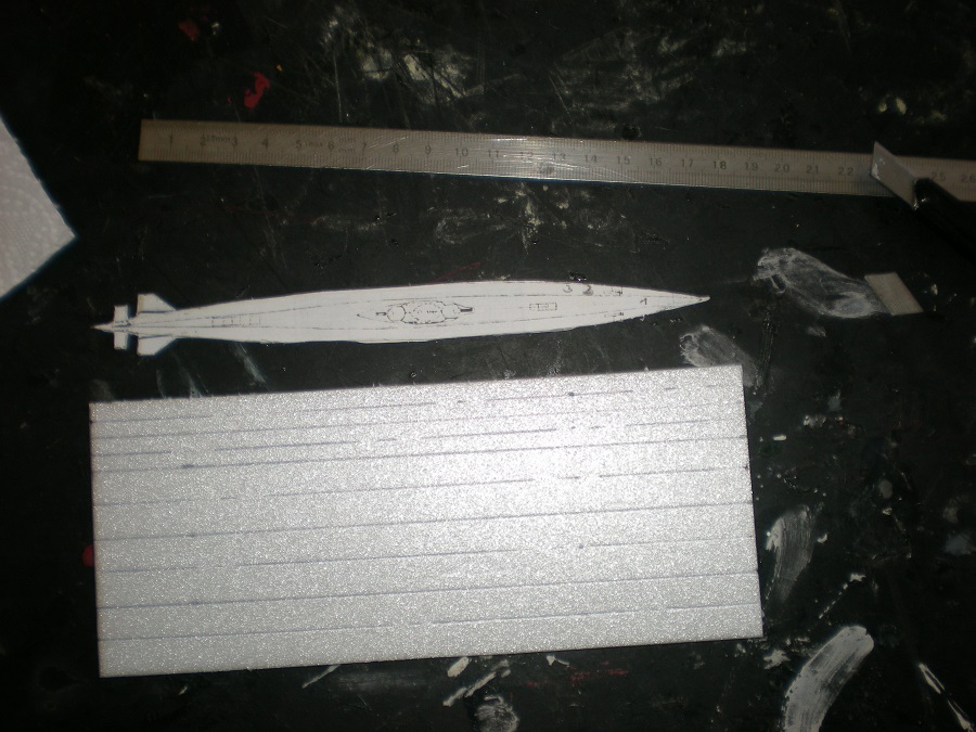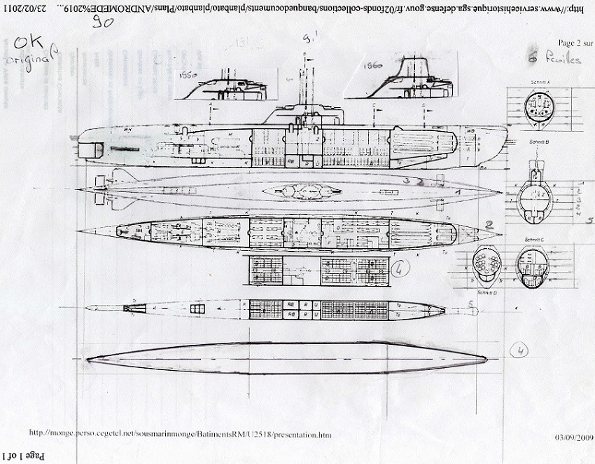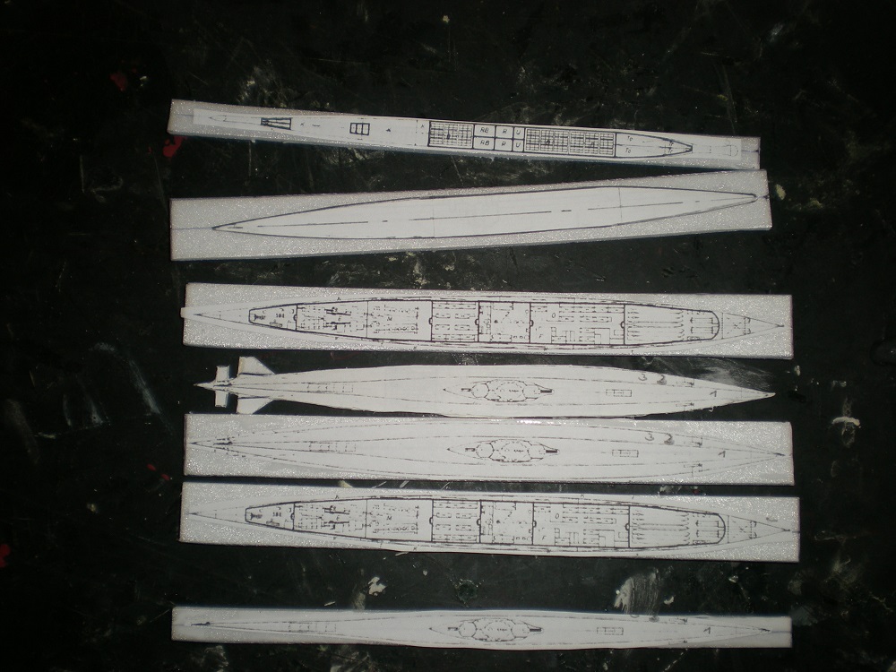 Ma méthode repose sur le dépron, j'effectue mon plan au 1/400.Pour exemple le type XXI.J'ai opté pour la conception horizontale en prenant pour 1er élément celui des safrans de barres de plongées arrières.puis j'ai collé les autres tranches de part et d'autres.Voir photos