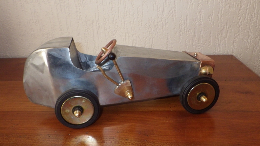 Quelques chutes de zinc restant de la construction du Hunley, un peu de laiton et de cuivre qui traînaient dans l'atelier, et hop une petite voiture artisanale de 25 cm de long environ(modèle unique